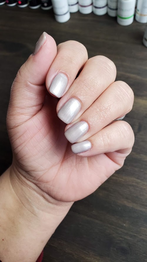 Sandy grey. Pearl finish. Neutral undertone. Pale.